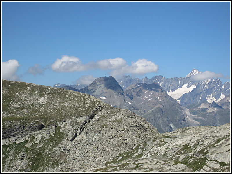 Il Grand Tournalin al centro, visto dal Corno Vitello. Si distinguono le due cime solcate dal profondo intaglio.