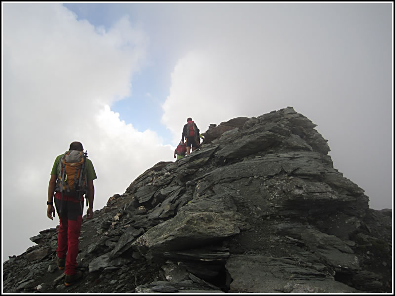 Oltre la cima Sud, una facile cengia conduce verso l'intaglio.