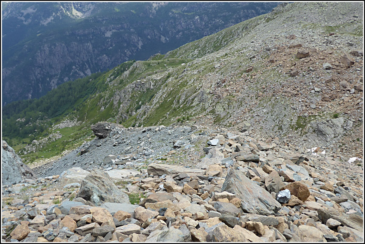 Il tratto di ripida e infinita cresta morenica da ripercorrere in discesa...